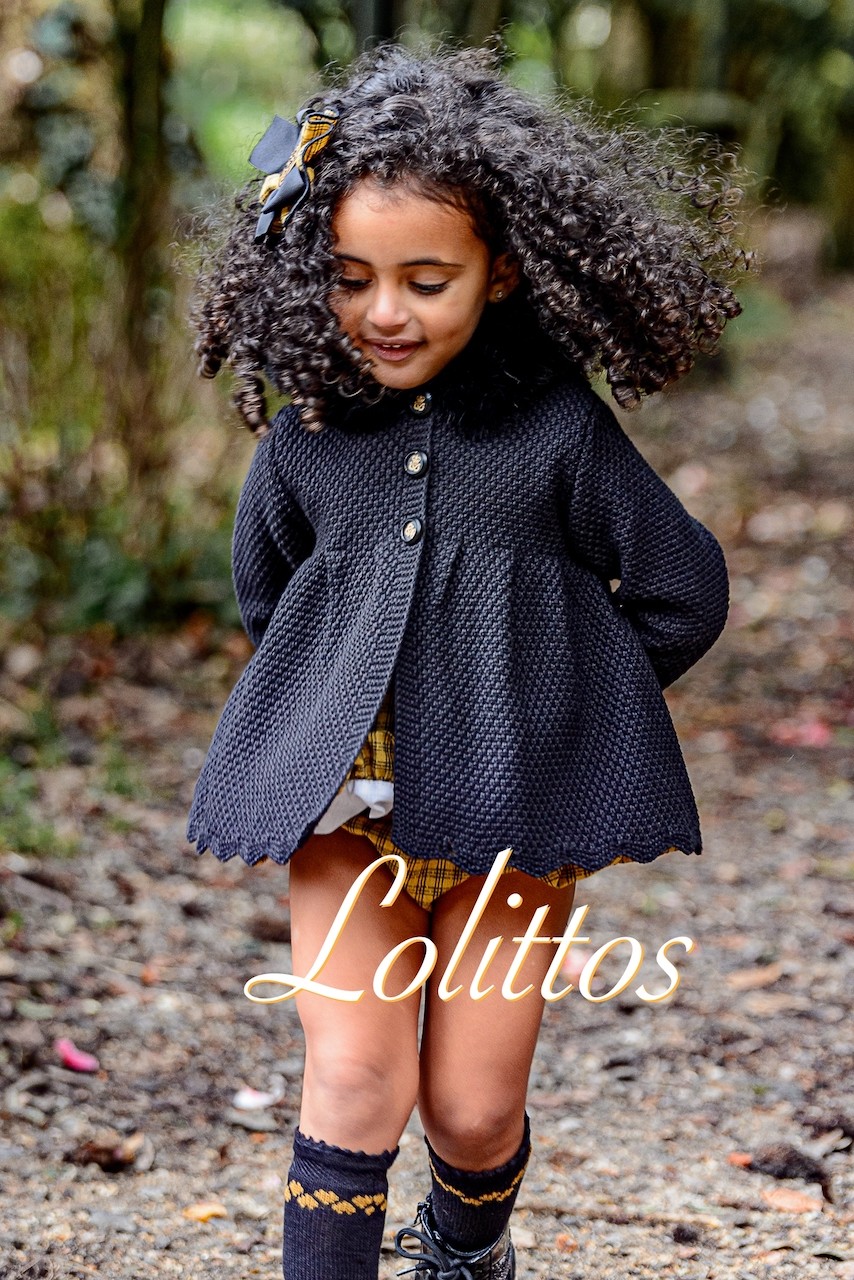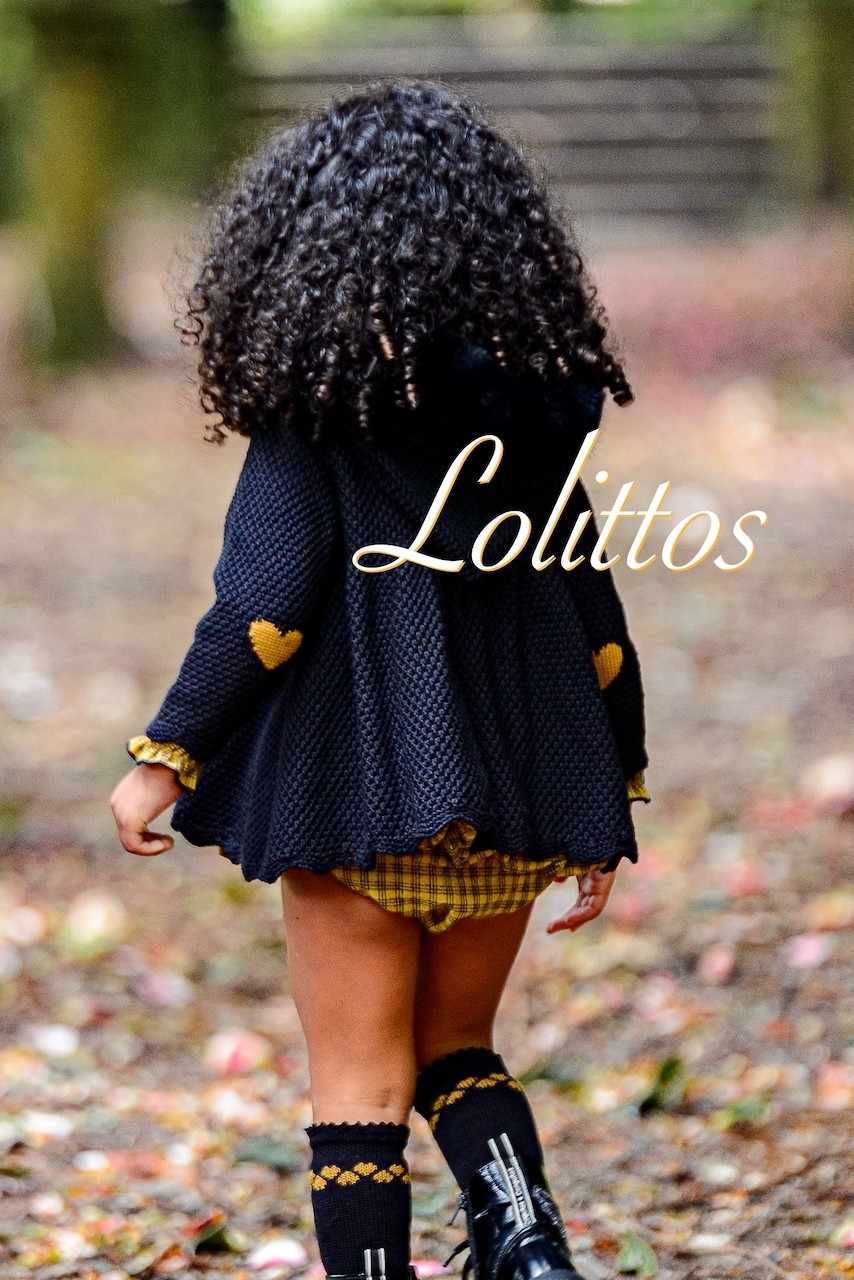 Abrigo de punto en negro con detalles en oro, como sus coderas en forma de corazón, marca Lolittos.