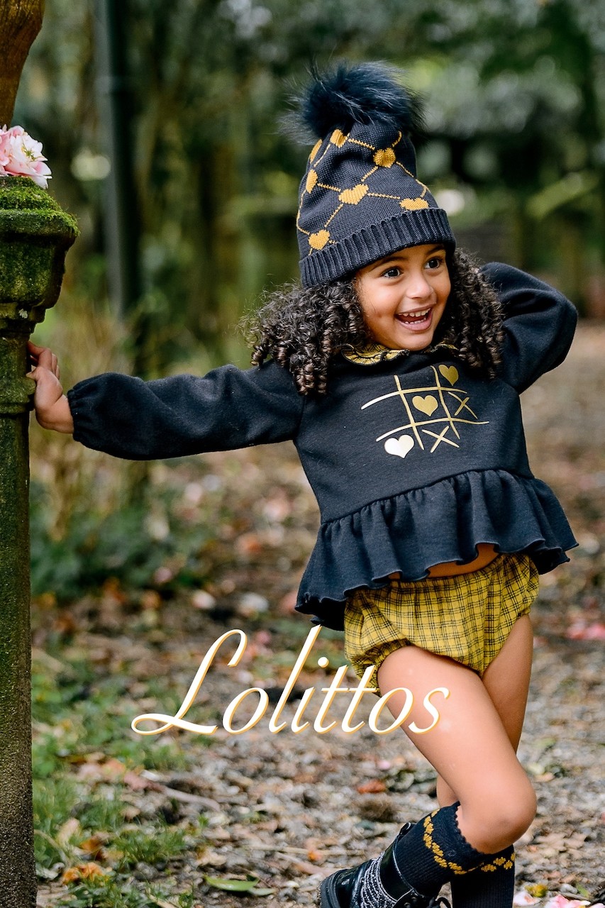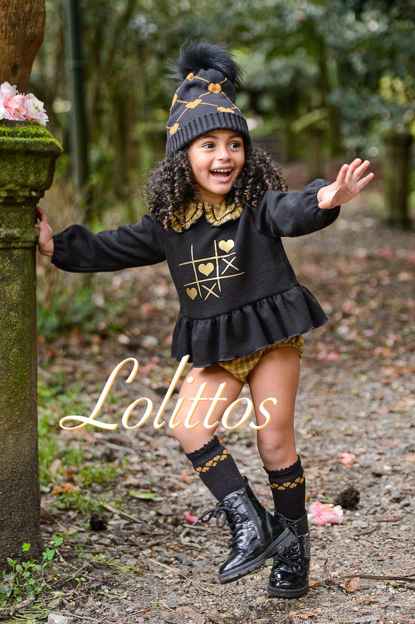 Gorro en negro con maxi pompón y corazones en mostaza, marca Lolittos.