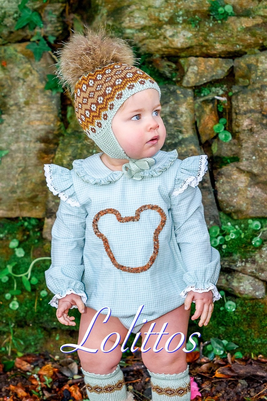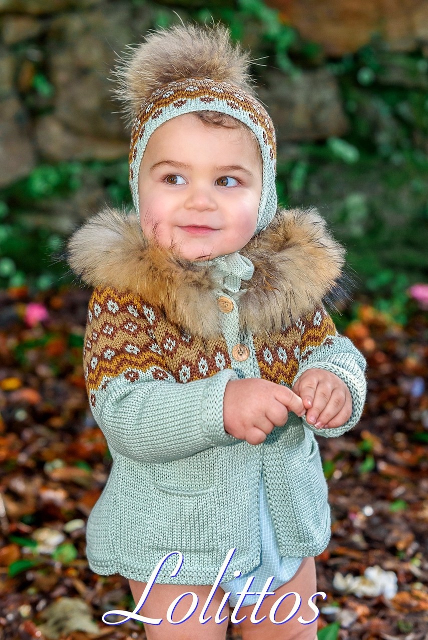 Gorro en verde agua y marrón, con tiras de sujeción y pompón natural, marca Lolittos.