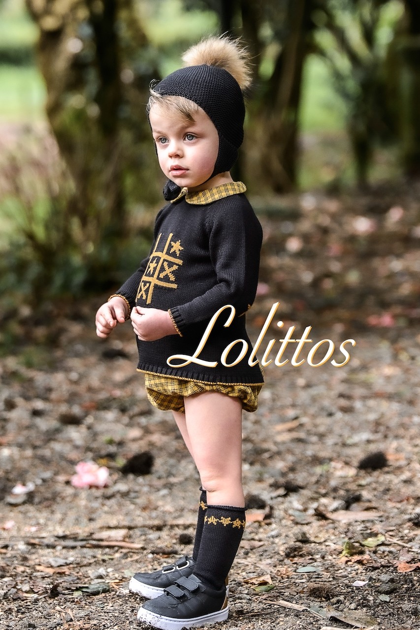 Jubón en negro con simpático dibujo del tres en raya en mostaza, a juego ranita en cuadros mostaza y negro, conjunto de la marca Lolittos.