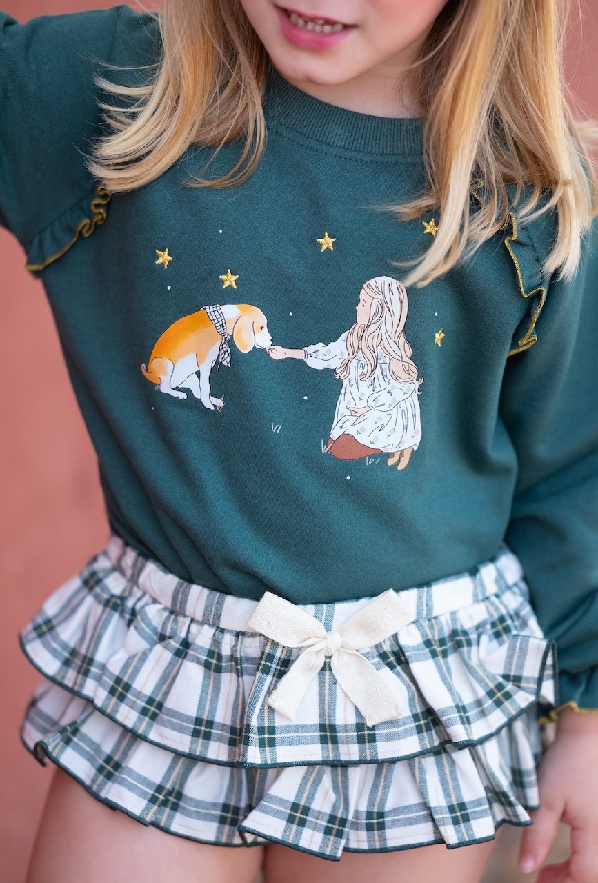 Felpa con detalles en color oro, a juego ranita de volantes cuadros verde botella.