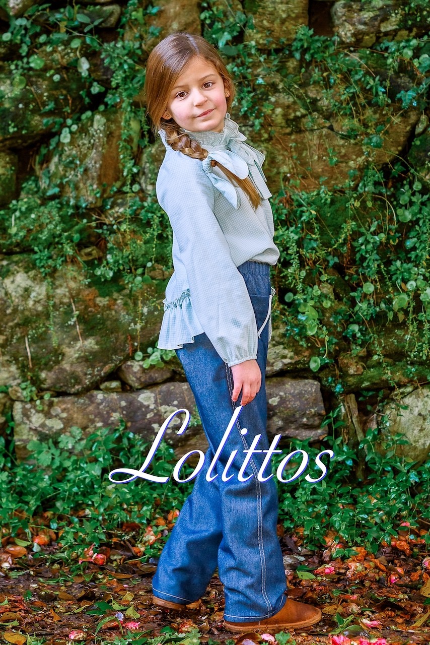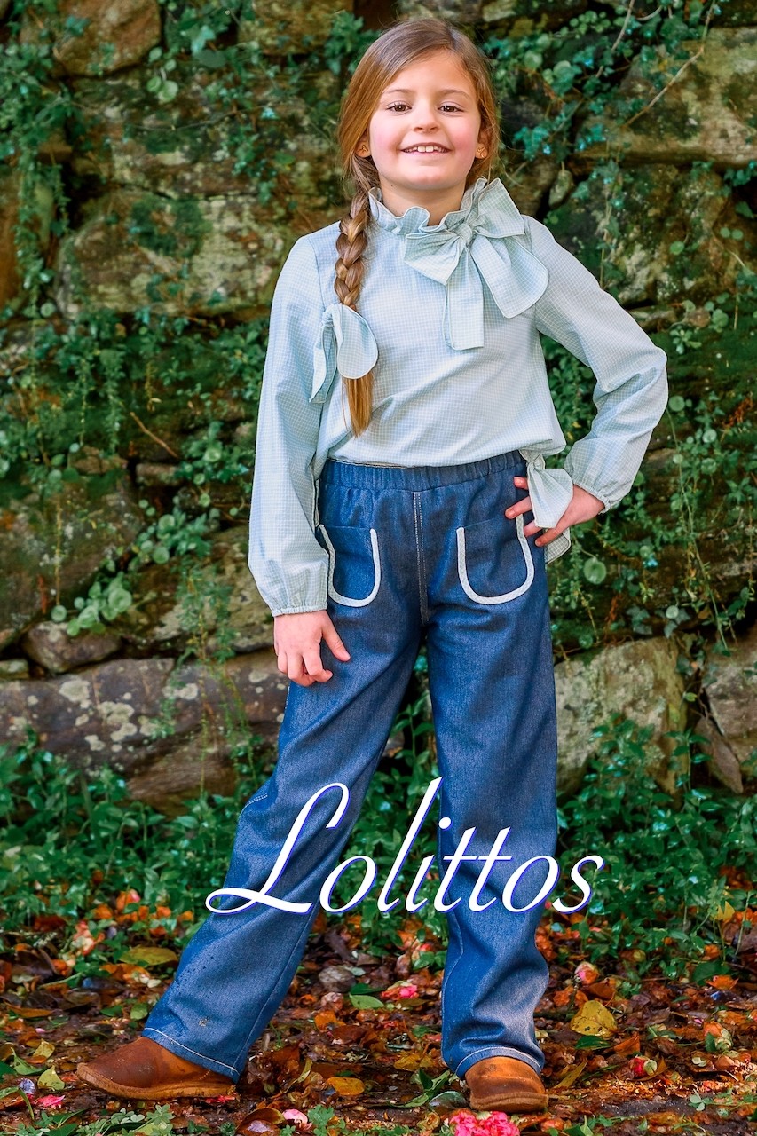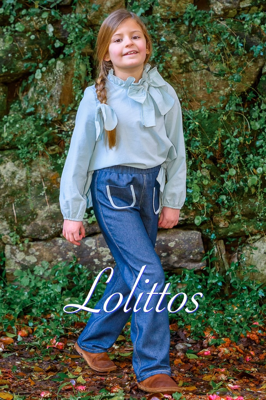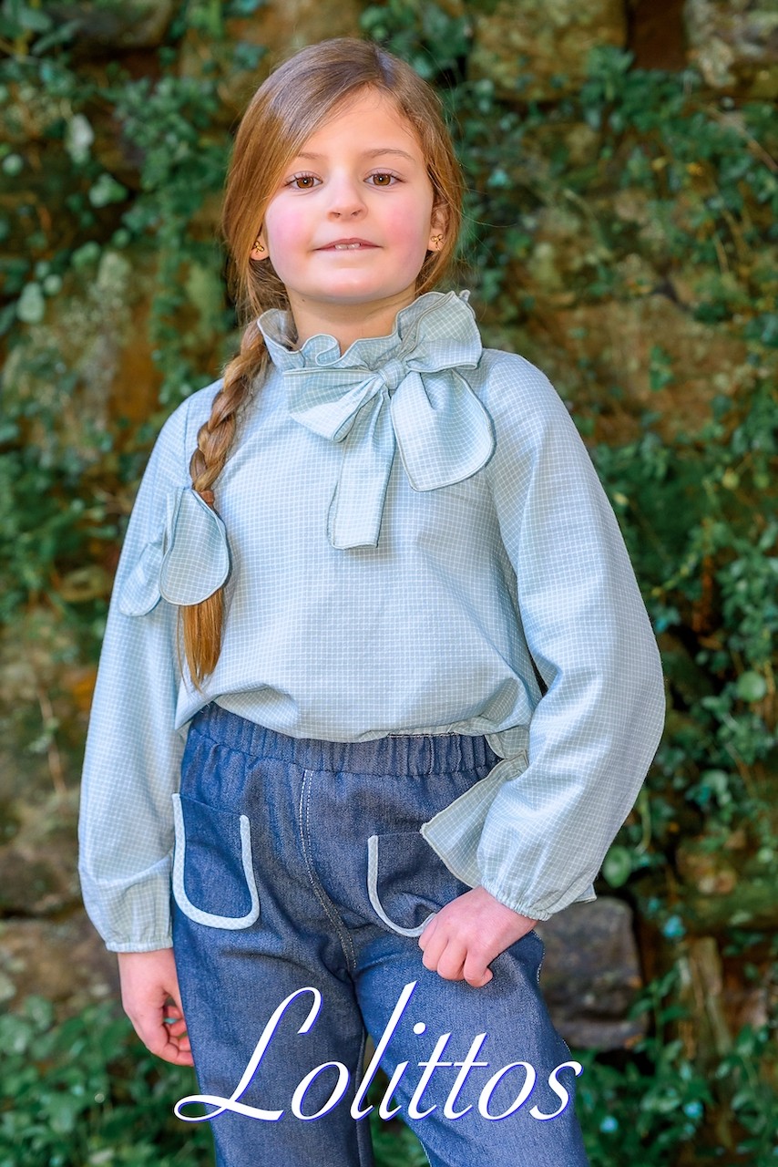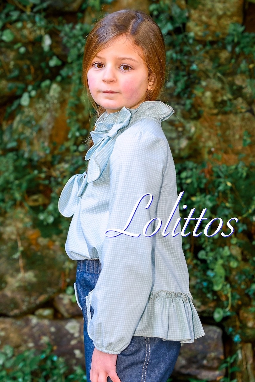 Camisa en cuadros verde agua con volante en la parte trasera y gran lazada en el cuello, a juego palazzo vaquero tiro alto con goma, muy cómodo, marca Lolittos.