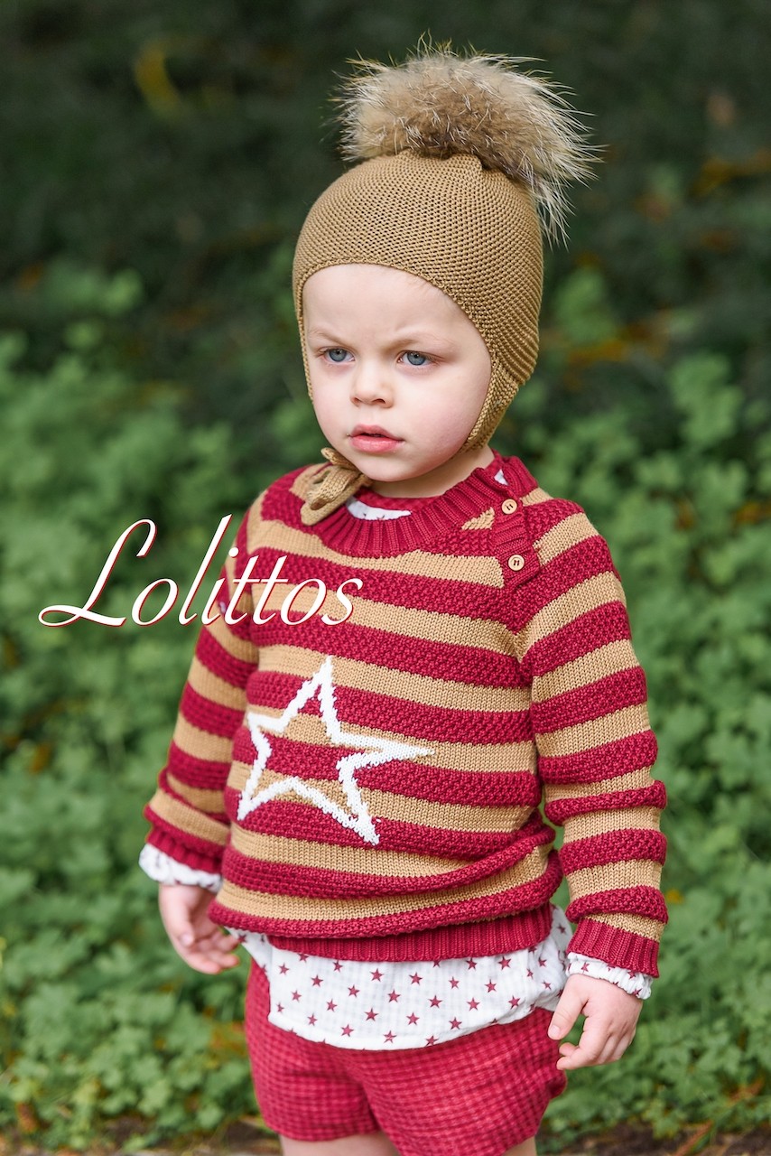 Jersey en listas granate y camel con estrella central en blanco.