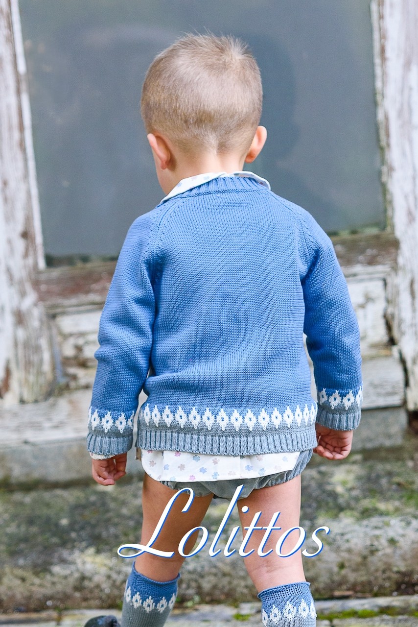 Jersey azul con un dulce ratoncito, lleva una greca gris en el bajo.