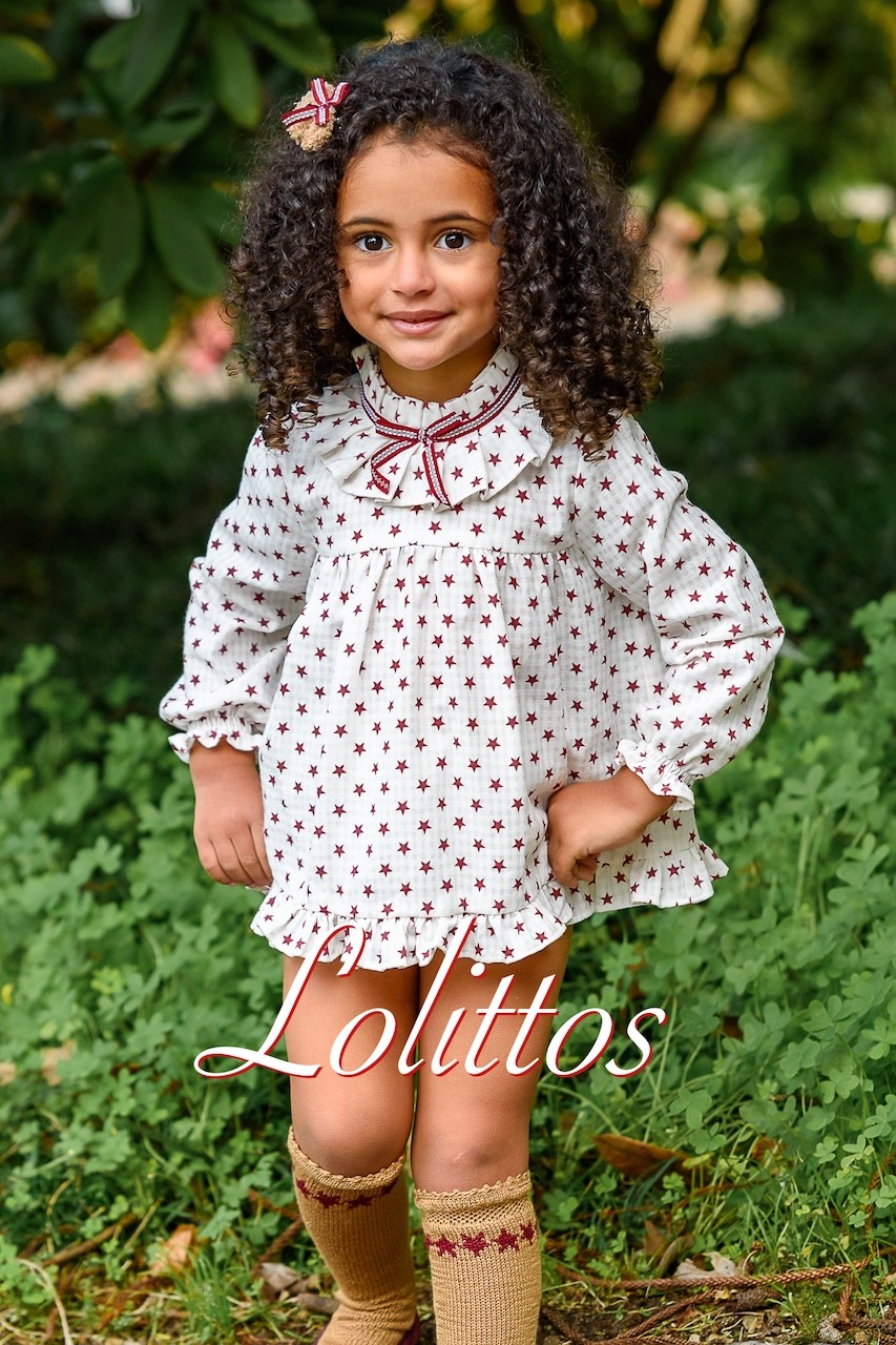 Jesusito con estrellas en granate, cuello plisado y cubre a juego.