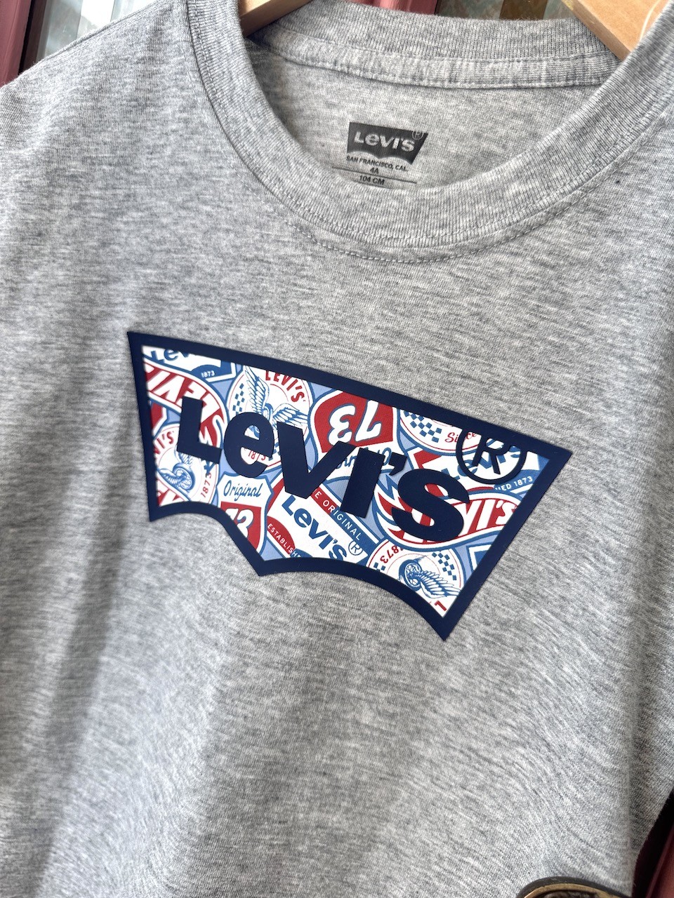 Camiseta en gris de la marca Levi´s, lleva un logo con granate, marino y azulón.