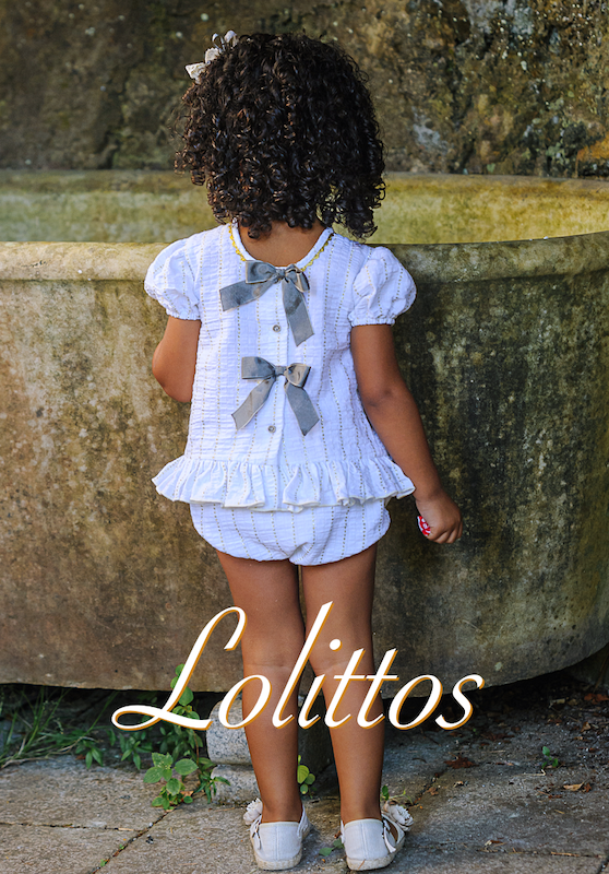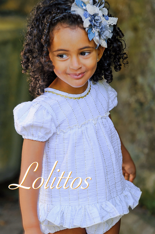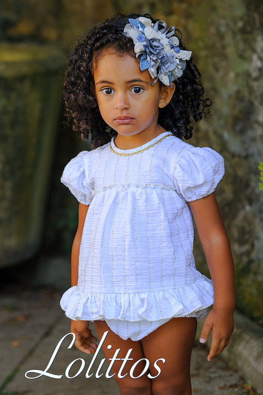 Jesusito con cubre a juego en blanco con lurex oro, en su espalda lleva unos dulces lazos en gris.