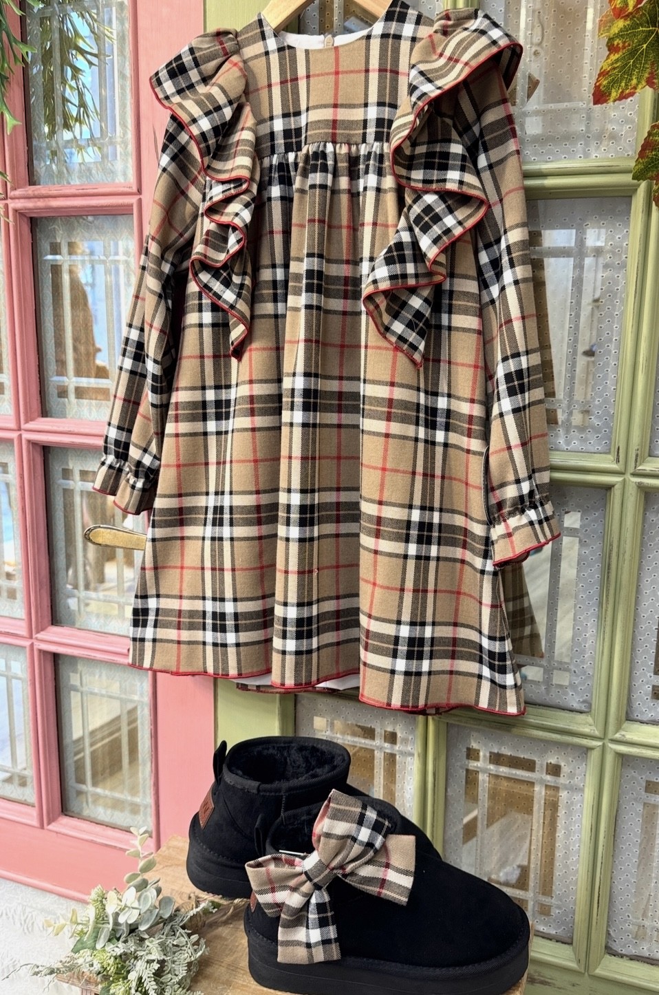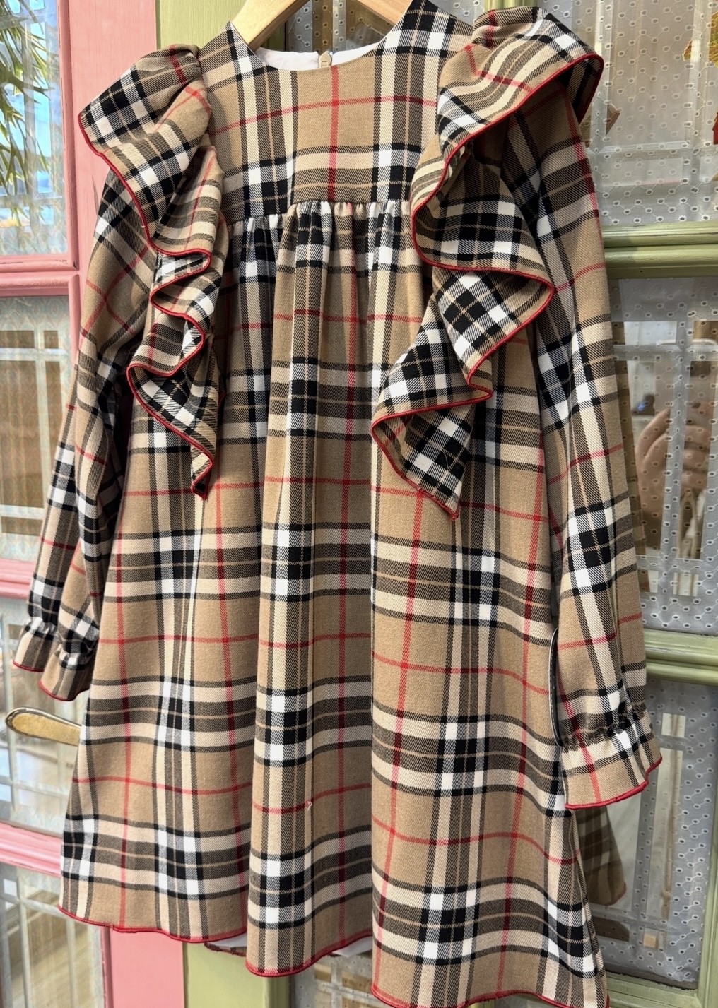 Vestido con volante mariposa en los hombros y estampado en cuadro escocés de la marca Monpetitbombón.